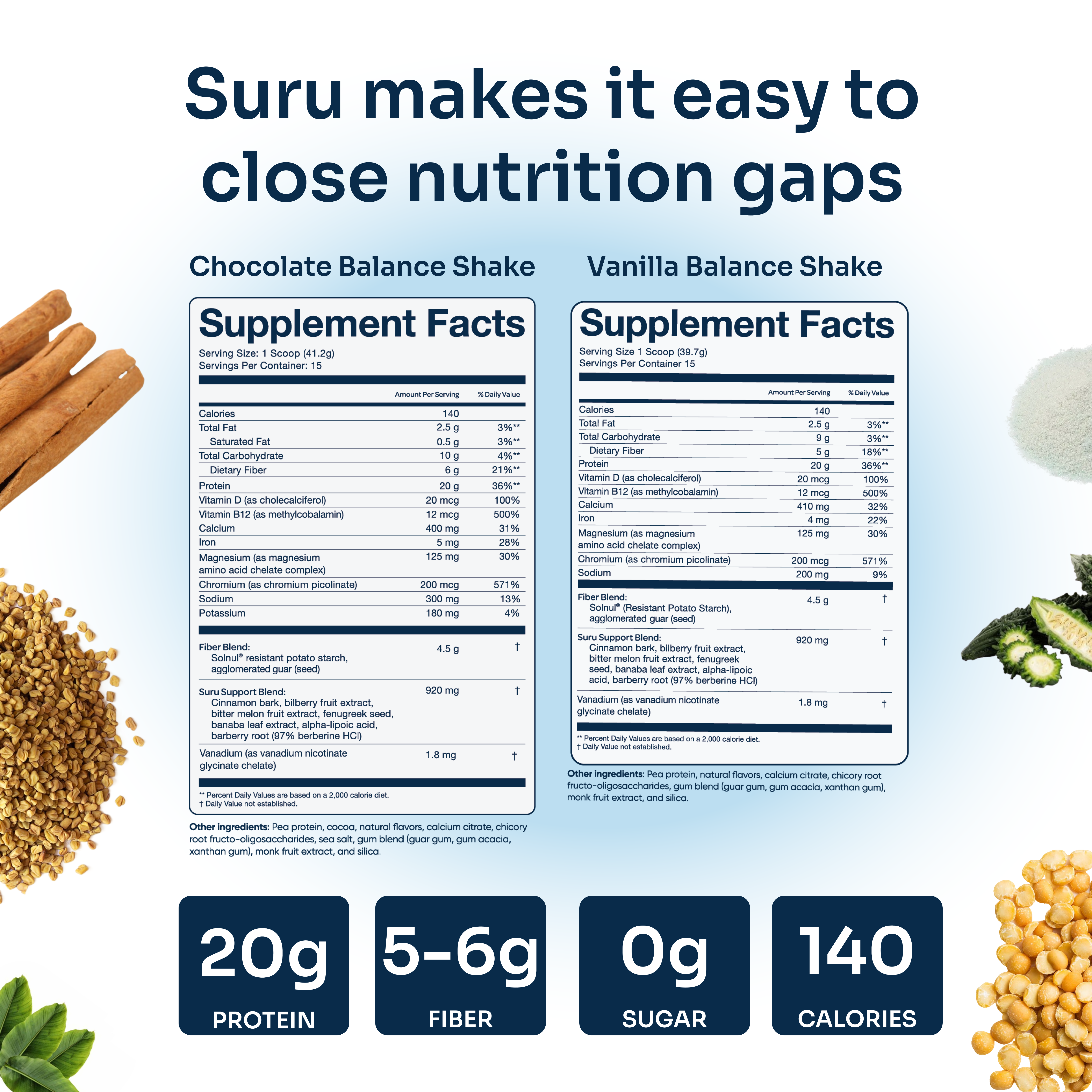 Suru contains 20g of plant-based protein, 6g of fiber, 4g of net carbs, and 2.5g of fats, with essential vitamins, minerals, and prebiotics. It has 140 calories per serving and is made without added sugars, artificial sweeteners, or artificial colors. Full supplement facts here.